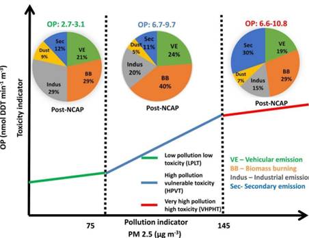 The team led by Prof Chatterjee has shown that there is a non-linear relationship between the PM2.5 pollution load and its toxicity (OP). Up to the PM2.5 pollution load of around 70 µg m-3, the toxicity remains unchanged. With the increase in PM2.5, the OP values show a jump and sudden rise till the PM2.5 pollution reaches at around 130 µg m-3. With the further increase in PM2.5 load exceeding 130 µg m-3, OP values do not change much.